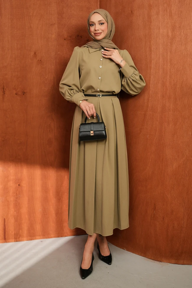 * Ürün Detay : Gömlek-etek takımı, tek renk şıklığın ve eforsuz zarafetin çok başarılı bir örneği. Hem profesyonel hem de günlük kullanım için oldukça güçlü bir duruş sergiliyor.Balon kol detayı ve manşetlerdeki düğmeler, klasik bir gömleğe modern ve feminen bir hava katmış.Yüksek bel ve kloş kesim, silüeti oldukça zarif gösteriyor. İnce kemer, bel hattını belirginleştirerek takımı iki parça olmaktan çıkarıp bütünsel bir görünüm kazandırmış.