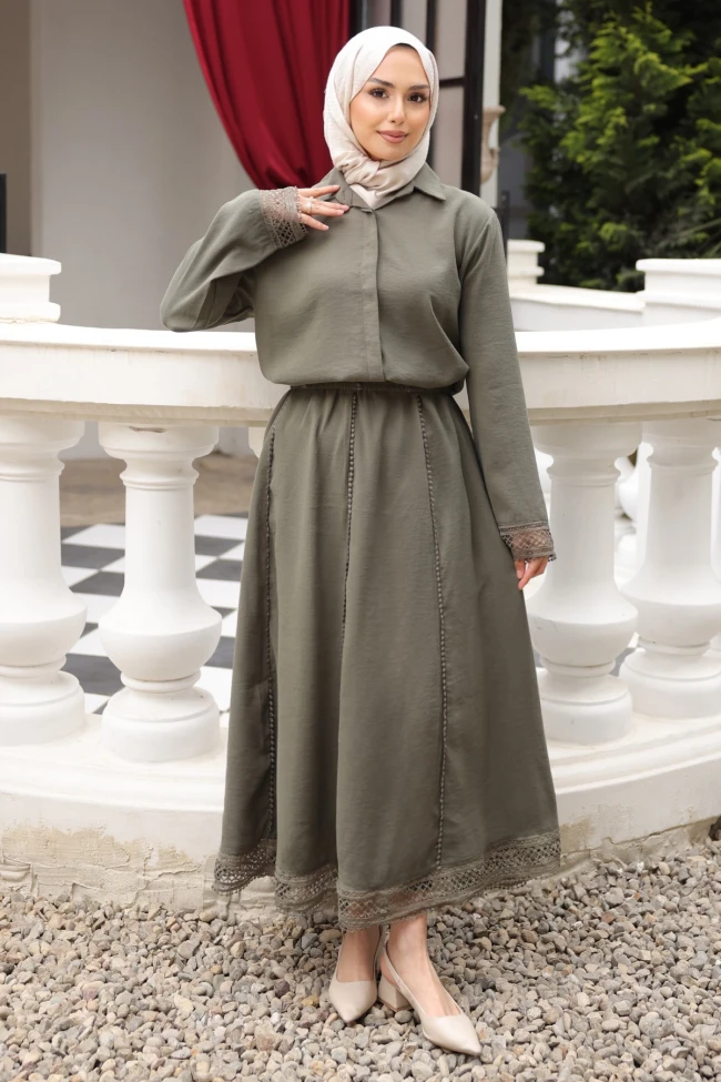 * Ürün Detay : Gömlek etek takımı, romantik dantel detayları ve keten görünümlü dokusuyla oldukça zarif bir duruş sergiliyor. Bohem şıklığı modern muhafazakar çizgilerle birleştiren, hem günlük hem de özel davetler için uygun olan çok yönlü bir tasarım.Manşetlerdeki geniş dantel detayları, sade gömleğe romantik bir hareket katıyor.A-kesim, geniş ve dökümlü etek yapısı, dikey şerit halindeki fisto detaylarıyla zenginleştirilmiş. Etek ucundaki geniş dantel bordür, takımın manşetleriyle mükemmel bir bütünlük sağlıyor.Etek bel lastiklidir.