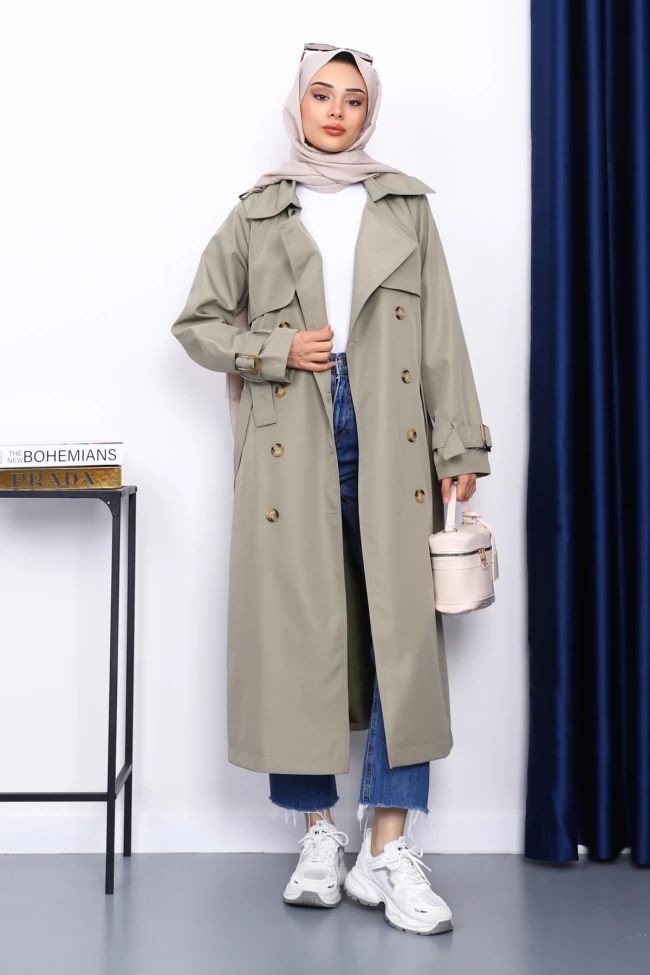 Siyah Kravuze Yaka Kuşaklı Trençkot
