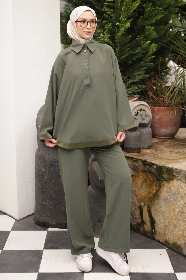* Ürün Detay :Modern tesettür giyimde çok sevilen "çabasız şıklık" ve konforu bir araya getiren bir parça.Tuniğin polo yaka ve yarım düğme patı detayı, ürüne spor-klasik arası bir hava katmış. Özellikle etek ucundaki ve kol ağızlarındaki garnili şeritler, takımı düz bir eşofman takımı olmaktan çıkarıp tasarım bir ürüne dönüştürmüş.Oldukça dökümlü ve geniş kesimi sayesinde, vücut hatlarını belli etmeyen ama hantal da durmayan bir silüet çiziyor. Pantolonun bol paça yapısı, tuniğin oversize formuyla mükemmel bir denge kurmuş.Pantolon yüksek bel, bel lastikli ve cepli.