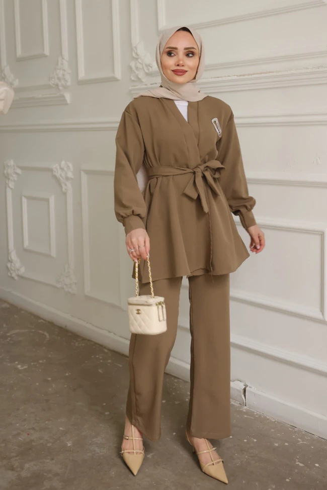* Ürün Detay : Yeni sezon takımımız için çaba gerektirmeyen şıklık diyoruz. Hem özel bir akşam yemeğinde hem de şık bir ofis gününde giyilebilir.Pantolon ve üstün aynı renk olması, görsel bir kesinti oluşturmadığı için kişiyi olduğundan daha uzun ve ince gösterir.Balon kol ve manşet yapısı kullanılmış. Bu, takıma klasik bir ceketten ziyade daha feminen ve modern bir hava katıyor.Pantolon bol paça formunda. Üstün dökümlü yapısıyla uyum içinde, akıcı bir silüet oluşturuyor.