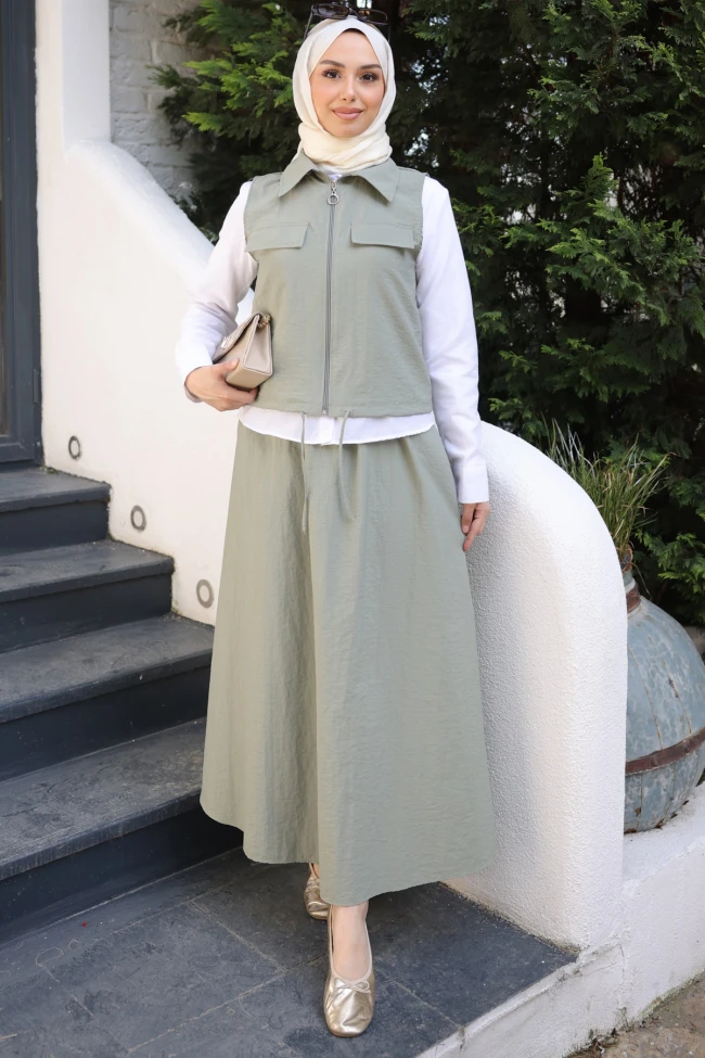 * Ürün Detay : Hem modern hem de modest giyim tarzını bir araya getiren oldukça dengeli ve şık bir kombin.Fermuarlı ve cepli yapısı takıma sportif bir hava katmış. Bel kısmındaki ayarlanabilir bağcık detayı, yeleğin formunu kişiselleştirmeye olanak tanıyor.Geniş kesimli ve dökümlü yapısı, hem konforu hem de şıklığı bir arada sunuyor. Kumaşın hafif dokulu olması, ütü derdini azaltan pratik bir tercih.Klasik beyaz gömlek, yeleğin altından hafifçe görünerek katmanlı bir görünüm oluşturmuş. Bu, stil sahibi bir derinlik katıyor. Etek ceplidir.