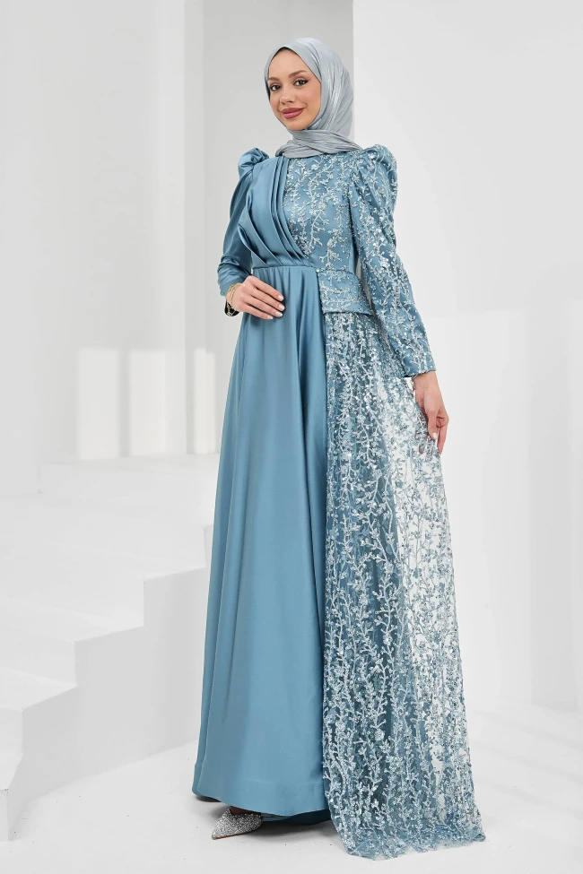* Ürün Detay : Geleneksel tesettür giyim ile modern tasarım detaylarını birleştiren oldukça gösterişli ve dengeli bir model. Özellikle özel davetler ve düğünler için hem zarif hem de iddialı bir tercih olarak öne çıkıyor.Gümüş ışıltılarla birleştiğinde oldukça premium bir hava katmış.Elbisenin en dikkat çekici kısmı, sol omuzdan aşağıya doğru süzülen ve etek ucuna kadar uzanan dantel tül detay. Bu asimetri, elbiseyi klasik bir düz kesimden kurtarıp modern bir "couture" havası veriyor.Gövdedeki çapraz gelen drapeli saten bölüm, bel hattını belirginleştirirken aynı zamanda vücut hatlarını zarifçe kamufle ediyor.Omuzlardaki hafif büzgü ve dantel işlemeli kollar, modele romantik bir dokunuş katmış.