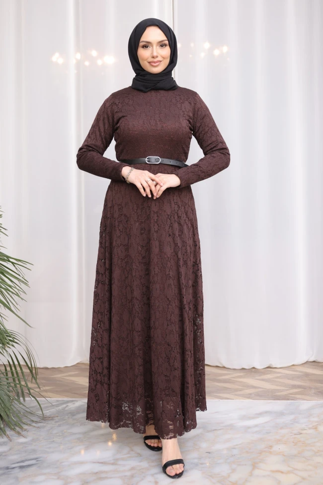 * Ürün Detay : Elbise, hem zarif hem de oldukça asil bir duruşa sahip.Elbisenin tamamının dantel kaplama olması, düz bir kumaşa göre çok daha zengin bir doku oluşturmuş. Dantelin deseni karmaşık ama göz yormuyor, bu da elbiseye romantik bir hava katıyor.Belden aşağıya doğru genişleyen kesim, hem konforlu bir hareket alanı sağlıyor hem de vücut hatlarını zarifçe gizleyerek dengeli bir silüet oluşturuyor.İnce kemer, elbiseyi hareketlendirmiş ve bel hattını belirginleştirerek "kum saati" görünümü yaratmış. Kemerin sadeliği, dantelin hareketliliğini güzelce dengelemiş.