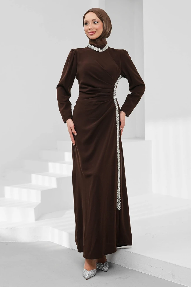 * Ürün Detay : Abiye, zarafeti ve modest çizgileri çok şık bir şekilde harmanlamış.Gövdeden yan tarafa doğru süzülen drapeler, bel bölgesini daha ince gösterirken elbiseye hareket katmış. Düz kesim etek formu ise boyu olduğundan daha uzun gösterme avantajına sahip.Yakadaki ve yan taraftaki taş işlemeler, ekstra kolye takma ihtiyacını ortadan kaldırarak odak noktasını yukarıya ve silüetin hatlarına çekmiş. Yan taraftaki şerit, elbiseye modern bir asimetri kazandırmış.