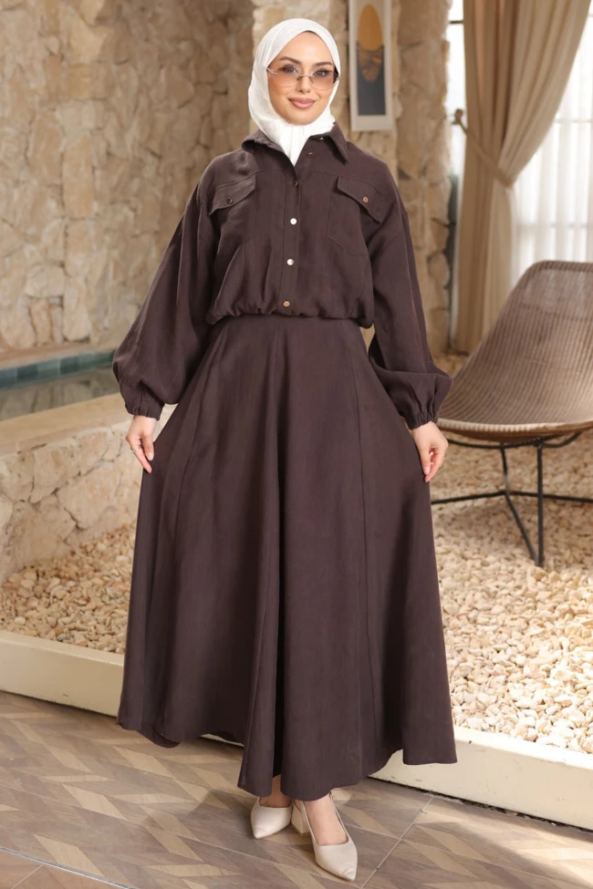 * Ürün Detay : Takım, "çaba sarf etmeden şık" görünmek isteyenler için ideal bir parça.Göğüs cepleri ve metalik düğme detayları takıma dinamik bir hava katmış. Bel kısmındaki büzgü detayı, ceketin formunu korurken vücut hatlarını zarifçe gizliyor. Balon kol kesimi ise tasarıma modern bir dokunuş eklemiş.Yüksek bel kesimi ve çan kesim, boyu daha uzun gösterme avantajına sahip. Eteğin dökümü oldukça muntazam duruyor, bu da kumaş kalitesinin iyi olduğuna işaret eder.Ceket bel ve manşet lastikli.