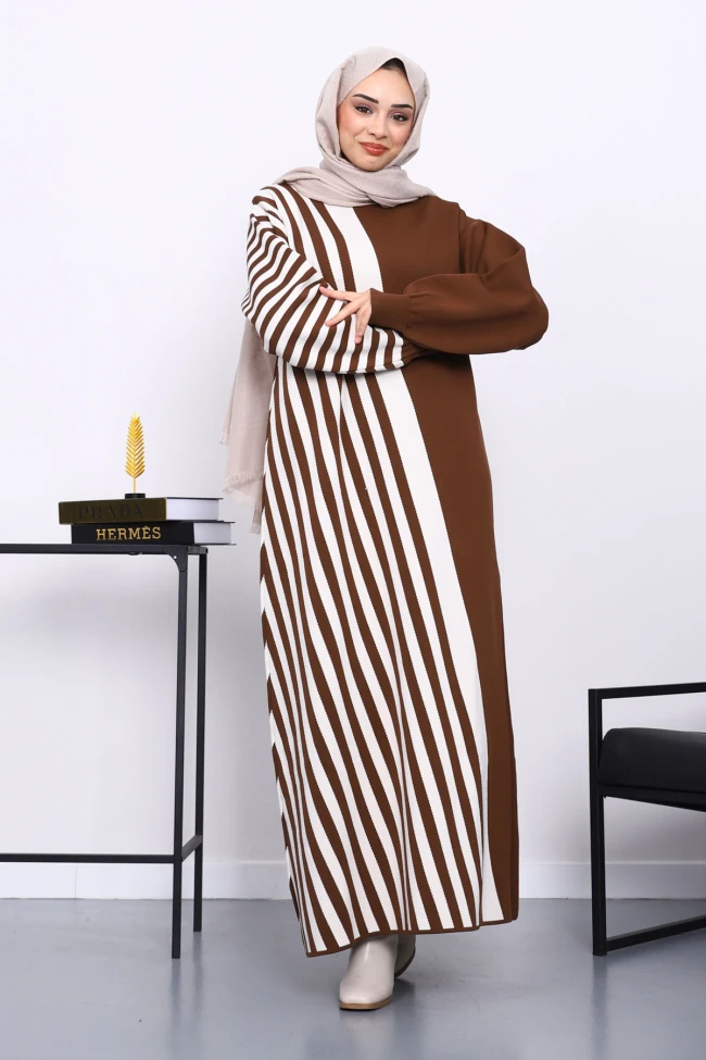 Ekru Çizgili Triko Elbise Saks Mavi Çizgili Triko Elbise Bordo Çizgili Triko Elbise Füme Çizgili Triko Elbise