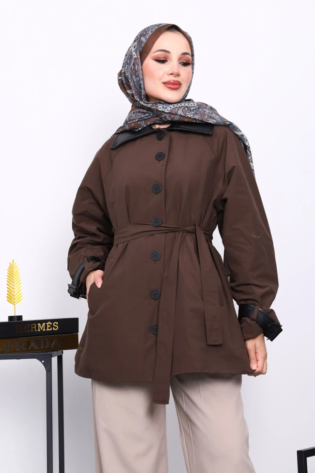 Mürdüm Deri Detaylı Kuşaklı Trençkot Bej Deri Detaylı Kuşaklı Trençkot Haki Deri Detaylı Kuşaklı Trençkot