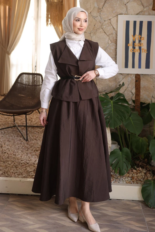 * Ürün Detay : Yelek-etek takımı, hem modern hem de klasik çizgileri birleştiren, oldukça zarif bir tesettür kombin örneği.Kruvaze yaka kesimi ve beldeki ince kemer detayı, takıma maskülen bir dokunuş katarken aynı zamanda feminen bir silüet oluşturuyor. Belin vurgulanması, alt kısımdaki volanlı yapıyla birleşince modern bir hava katmış.Yüksek bel ve çan kesim etek, hem konforlu bir hareket alanı sağlıyor hem de oldukça asil duruyor. Etek yan  fermuarlı arka bel lastikli.Yelek astarlı.