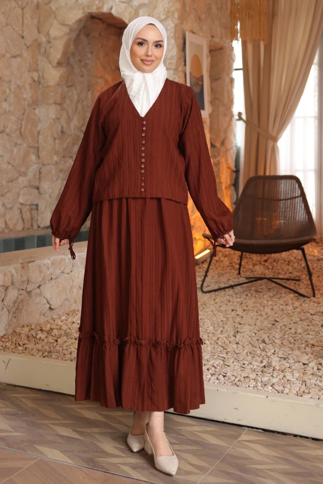 * Ürün Detay : Takım, hem modern hem de geleneksel çizgileri birleştiren, oldukça zarif ve "bohem-şık" bir havaya sahip.Öndeki sık düğme detayı takıma nostaljik bir hava katarken, V yaka kesimi boynu daha uzun gösteriyor. Kol ağızlarındaki büzgü ve bağlama detayları ise çok zarif bir hareket katmış.Eteğin alt kısmındaki fırfır detayı, takımı daha dinamik ve feminen bir hale getirmiş. Boyu ve dökümü oldukça dengeli duruyor.