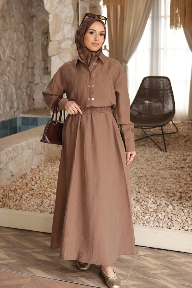 * Ürün Detay : Takım olmanın pratikliği, tek parça şıklığıyla birleşti. İster beraber giyin, ister parçaları farklı kombinlerle değerlendirin; dolabınızın en joker parçası olmaya aday!Hem zarafeti hem de konforu bir arada arayanlar için gerçek bir "kurtarıcı parça" niteliğinde.Gömlek boyunun etekle buluştuğu nokta, beli olduğundan daha ince gösterirken, eteğin geniş kesimi hareket özgürlüğü sunuyor.