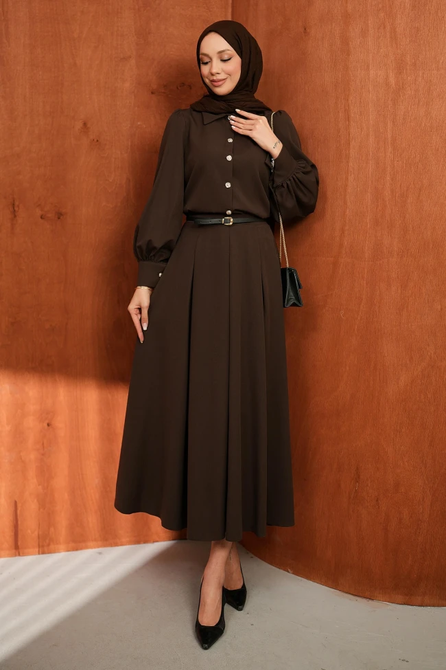 Siyah Düğmeli Kemerli Gömlek Etekli Takım Mürdüm Düğmeli Kemerli Gömlek Etekli Takım Haki Düğmeli Kemerli Gömlek Etekli Takım