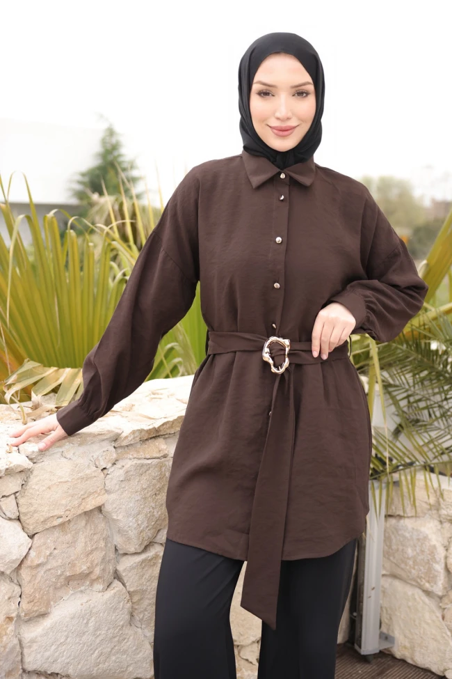 * Ürün Detay : Modern kesimi ve zarif detaylarıyla günün her anında şıklığınızı koruyun! Hem ofis şıklığı hem de günlük kullanım için tasarlanan bu tunik, gardırobunuzun favori parçası olmaya aday.Klasik gömlek yaka, gold düğme detayları ve beldeki estetik altın renkli toka ile zenginleştirilmiş kuşak tasarımı.Rahat kesim yapısı sayesinde hareket özgürlüğü sunar ve her vücut tipine uyum sağlar.