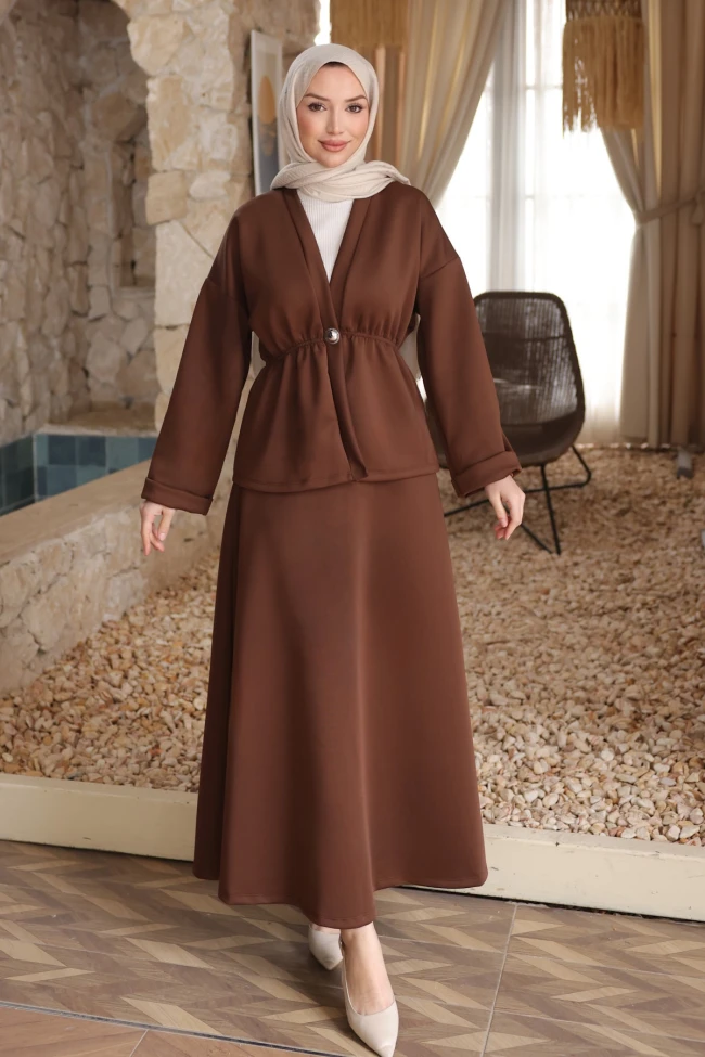 * Ürün Detay : Takım, hem modern hem de zarif bir çizgiye sahip, özellikle minimalist ve konfor odaklı bir stil arayanlar için harika bir seçenek.Belden büzgülü ceket kesimi, vücut hatlarını nezaketle dengeliyor. Tek düğme detayı, tasarımı karmaşadan uzaklaştırıp odak noktasını bel hattına çekmiş. Düşük omuz ve geniş kollar, takıma hem spor hem de bohem bir hava katıyor.A kesim etek, zamansız bir parça. Boyu ve dökümü oldukça asil duruyor. Kumaşın tok duruşu, eteğin formunu korumasını sağlamış.