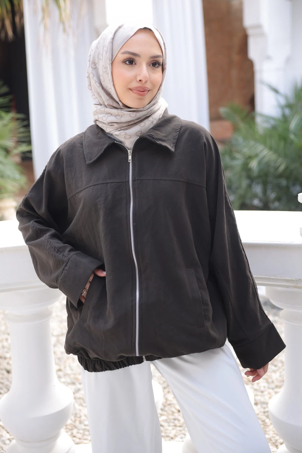 * Ürün Detay : Dokusuyla bahar aylarının vazgeçilmezi olmaya aday bir parça.Bomber ceket esintili, geniş ve rahat kalıbı, modern stiliyle tesettür giyimin konforunu çok iyi harmanlamış. Alt kısımdaki lastik detayı, ceketine hafif bir hacim vererek duruşunu netleştiriyor.Metal fermuar detayı, koyu renk üzerinde şık bir kontrast oluştururken, geniş yaka yapısı ürüne klasik bir ceket havası da katmış. Gizli cep detayları ise kullanım kolaylığı ve bütünlük sağlıyor.İç astar kumaşı saten kumaştır.