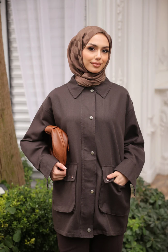 * Ürün Detay :Modest tarz oldukça şık, oversize bir ceket modelidir.Rahat ve dökümlü kesimi sayesinde konfor ön planda. Uzunluğu, tesettür giyim standartlarına uygun formda tasarlanmış.Öndeki büyük kapaklı cepler hem işlevsel hem de ürüne modern bir hava katıyor.Gümüş renkli çıtçıt düğmeler, mat kumaş üzerinde parlak bir kontrast oluşturarak ürünü hareketlendirmiş.Gömlek yaka detayı, ürünü daha yapısal ve derli toplu gösteriyor.Bu parça, gardırobun "kurtarıcı" elemanlarından biri olmaya aday.