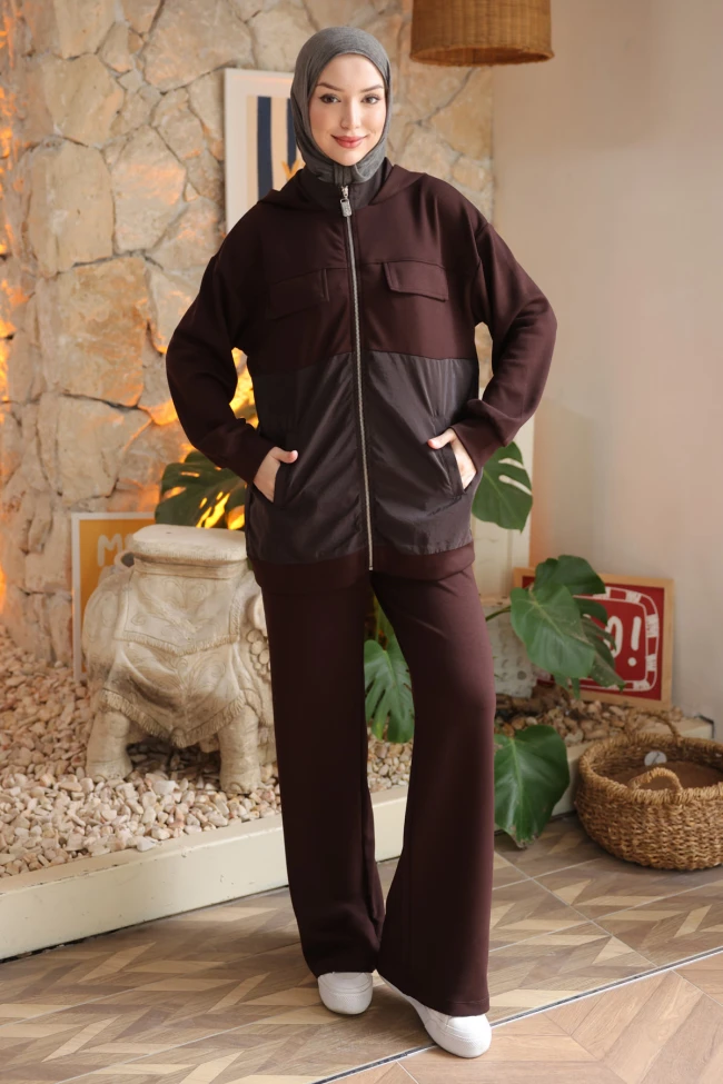 * Ürün Detay : Takım, hem konforu hem de modern şehir stilini bir araya getiren oldukça dengeli bir parça.Üst parçada kullanılan parlak garnili panel, tunik kumaşının matlığıyla şık bir kontrast oluşturmuşBoydan fermuar ve kapüşon detayı kullanım kolaylığı sağlarken, göğüs kısmındaki kapaklı cep detayları tasarıma biraz daha maskülen ve güçlü bir hava katmış.Pantolonun bol paça kesimi, hem tesettür standartlarına uygun bir siluet çiziyor hem de proporsiyonu daha uzun ve ince gösteriyor.