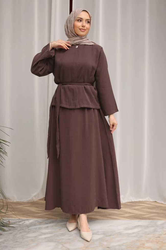 * Ürün Detay : Takım, hem sofistike duruşu hem de sağladığı konforla modest giyimin en güçlü örneklerinden biri olmuş.Gömlek formundaki üst parça, beldeki kuşak detayı sayesinde vücut formunu zarifçe ortaya çıkarıyor. Hakim yaka ve tek düğme detayı, ürüne minimalist ve asil bir hava katmış. Geniş kesim kolları ise tesettür giyimde aranan rahatlığı sağlıyor.A-kesim, dökümlü uzun etek; üst parça ile mükemmel bir bütünlük içersinde.