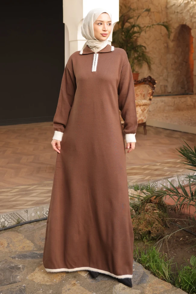 Yeşil Gömlek Yaka Fermuarlı Triko Elbise Füme Gömlek Yaka Fermuarlı Triko Elbise Vizon Gömlek Yaka Fermuarlı Triko Elbise