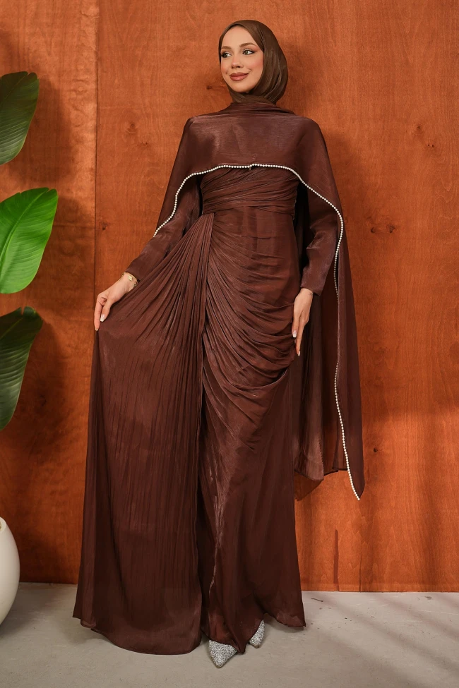 * Ürün Detay : Özel günleriniz için kurtarıcı parça! Kendinden pelerinli tasarımı sayesinde aksesuar zahmetine girmeden tam bir şıklık sunan abiyemiz, dikey pileli etek yapısıyla daha uzun ve ince bir görünüm vadediyor.Modern tesettür şıklığını inci zarafetiyle birleştirin.Bel bölgesindeki çapraz drape detayları, karın bölgesini kusursuz bir şekilde kamufle ederken, eteğin dikey pilleleri boyu olduğundan daha uzun gösteriyor.Omuzlardan dökülen tül pelerin, tasarıma dramatik bir hava katarken, kenarlarındaki inci işlemeler yüz hattını aydınlatan zarif bir çerçeve oluşturuyor.