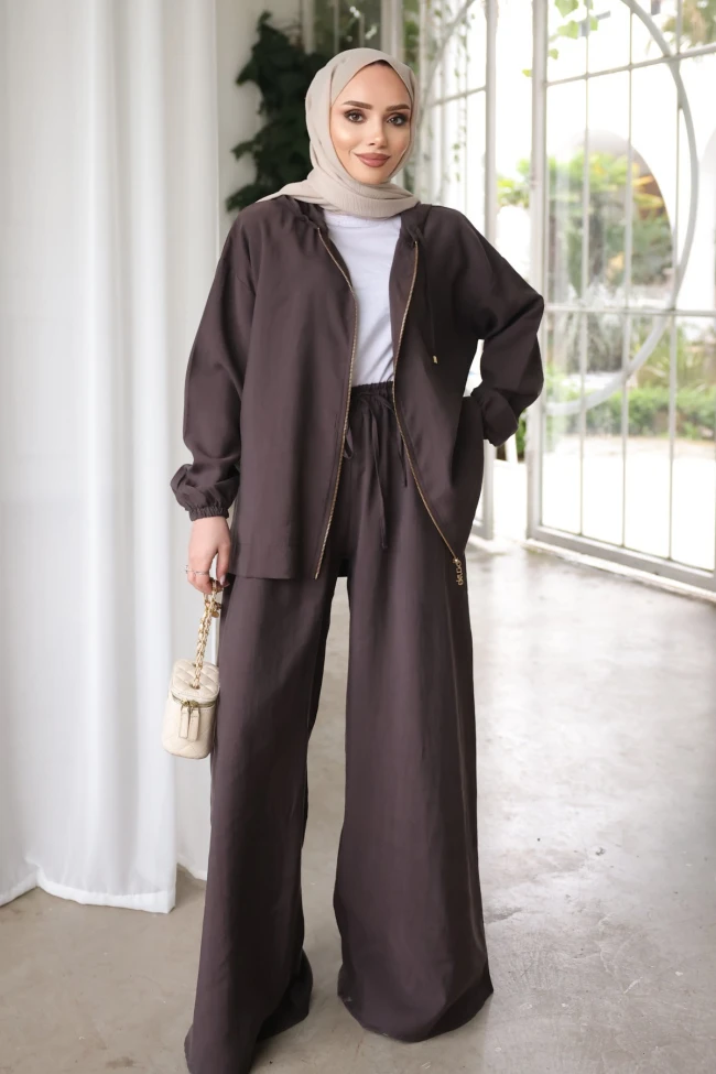 * Ürün Detay : Takım, modest giyimin en başarılı örneklerinden biri; hem konforlu hem de oldukça sofistike bir duruş sergiliyor.Kombinin en güçlü yanı oversize ve dökümlü yapısı. Geniş paça pantolon ile kapüşonlu ceketin salaşlığı, modern bir hava oluşturmuştur. Ceketin bel boyu, geniş paçalı pantolonun hacmini dengeleyerek silüeti boğmamış.Pantolon bel lastikli ve ceplidir.