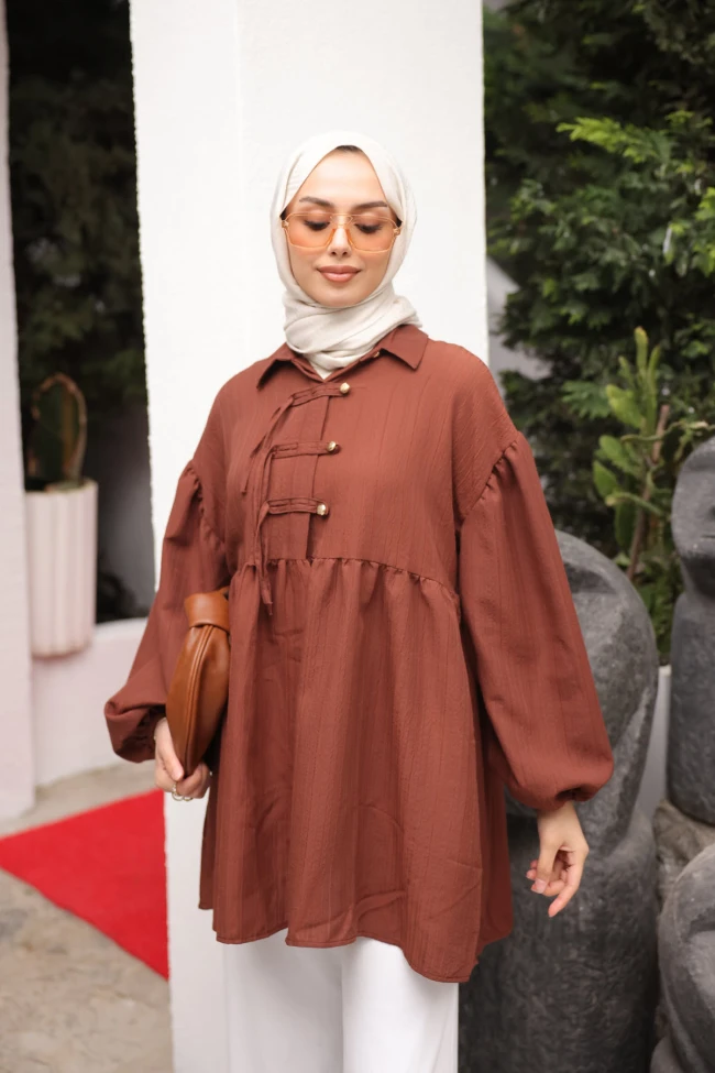 * Ürün Detay : Yeni sezon tunik modelimiz, özellikle modern tesettür giyiminde sıkça tercih edilen bohem ve konforlu bir tarza sahip.Tuniğin ön tarafındaki ince ip bağlama detayları,sıradan bir tunikten ayırıp "otantik" bir hava katmış.Robadan büzgülü ve geniş kesim olması, hem vücut hatlarını gizlemesi açısından avantajlı hem de içinde hareket etmeyi çok rahat kılıyor. Balon kollar ise tasarımı modernize etmiş.Kol manşetleri lastiklidir.