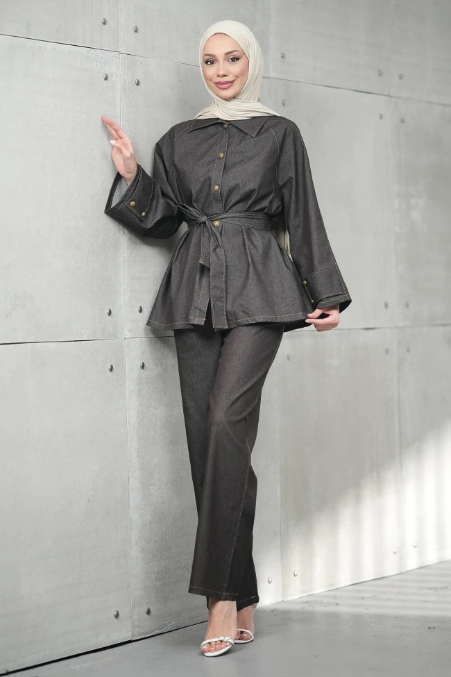 * Ürün Detay : Kot takım, hem modern hem de mütevazı giyim tarzını çok şık bir şekilde birleştirmiş.Beldeki kuşak detayı, silüeti belirginleştirerek feminen bir hava katmış. Geniş manşetler ve metal düğmeler, klasik kot ceket havasını daha sofistike bir "ceket-tunik" formuna taşımış.Bol paça kesim, hem rahatlık sunuyor hem de üzerindeki daha hareketli ceketle dengeli bir görünüm oluşturuyor. Boyu ve dökümü oldukça yerinde duruyor.Pantolon yüksek bel,bel lastikli ve ceplidir.