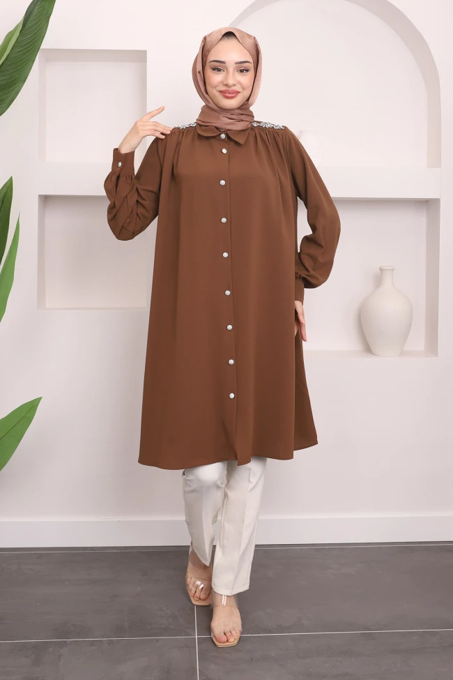 * Ürün Detay : Yeni sezona uygun Krep Kumaştan üretilmiştir. Omuz taşlıdır. Boydan düğme detayı bulunmakta olup gömlek yakadır.