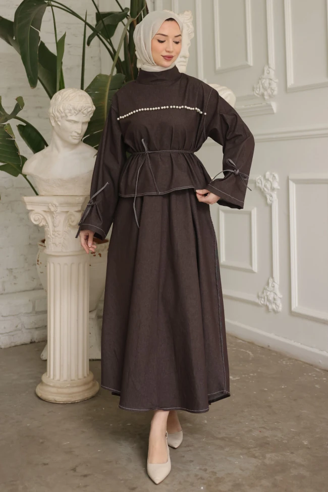* Ürün Detay : Denim hiç bu kadar zarif olmamıştı! İnci detayları ve kontrast dikişleriyle fark oluşturan bu özel tasarım, günlük şıklığınızı bir üst seviyeye taşıyor. Hem spor hem feminen; tam bir ikon parçası.Göğüs hizasındaki inci sıraları, spor bir kumaş olan denim dokusuna sofistike bir gece şıklığı katmış.Beyaz dikişler, koyu zemin üzerinde modern ve grafik bir görünüm oluşturuyor.Kol ağızlarındaki büzgü detayları, takıma feminen ve romantik bir hava veriyor.Geniş kesim uzun etek, hem konforlu bir hareket alanı sağlıyor hem de zarif bir silüet oluşturuyor.