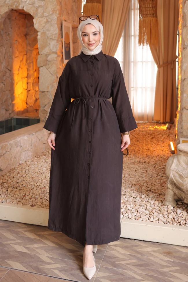* Ürün Detay : Elbise, hem zarafeti hem de konforu bir araya getiren modern ve modest bir tarza sahip. Boydan düğmeli yapısı ve klasik gömlek yakası, elbiseye hem resmi hem de günlük kullanıma uygun bir hava katıyor.Kolların düşük omuzlu kesimi, elbiseye daha rahat ve salaş bir görünüm kazandırarak modern bir dokunuş eklemiş.Beldeki ince ip kuşak, geniş kesimli kumaşı toparlayarak vücut hatlarını zarifçe belli ediyor ve silüeti daha dengeli gösteriyor.Ceplidir.