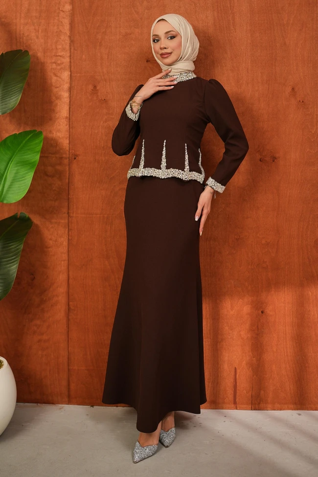 * Ürün Detay : Görseldeki abiye, modern ve klasik detayları harmanlayan, oldukça zarif bir tesettür abiye modeli.Elbise, vücut hatlarını naif bir şekilde takip eden ancak hareket özgürlüğü sunan balık kesim bir forma sahip. Bel kısmındaki taş işlemeleri, vücudu iki parçalı bir takım görünümü vererek daha uzun ve ince gösteren bir illüzyon yaratmış.Kumaş üzerine taş işlemeler kullanılmış. Özellikle dik yaka , manşetler ve beldeki asimetrik sarkıt işlemeler elbiseye zengin ve gösterişli bir hava katıyor.