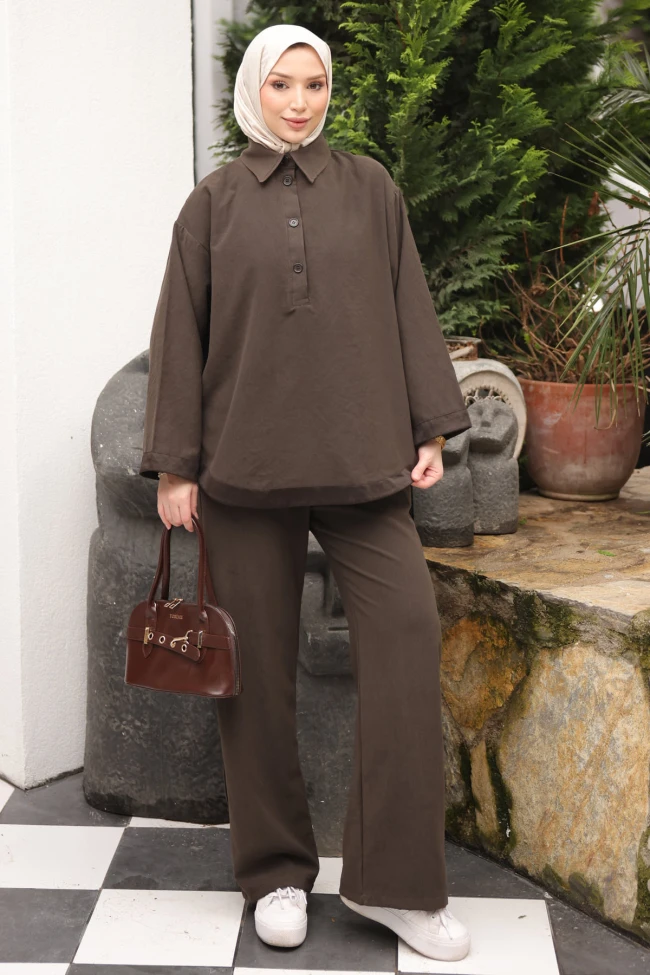 * Ürün Detay :Modern tesettür giyimde çok sevilen "çabasız şıklık" ve konforu bir araya getiren bir parça.Tuniğin polo yaka ve yarım düğme patı detayı, ürüne spor-klasik arası bir hava katmış. Özellikle etek ucundaki ve kol ağızlarındaki garnili şeritler, takımı düz bir eşofman takımı olmaktan çıkarıp tasarım bir ürüne dönüştürmüş.Oldukça dökümlü ve geniş kesimi sayesinde, vücut hatlarını belli etmeyen ama hantal da durmayan bir silüet çiziyor. Pantolonun bol paça yapısı, tuniğin oversize formuyla mükemmel bir denge kurmuş.Pantolon yüksek bel, bel lastikli ve cepli.