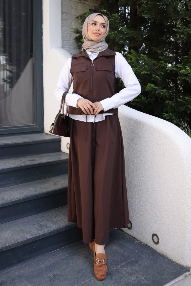 * Ürün Detay : Hem modern hem de modest giyim tarzını bir araya getiren oldukça dengeli ve şık bir kombin.Fermuarlı ve cepli yapısı takıma sportif bir hava katmış. Bel kısmındaki ayarlanabilir bağcık detayı, yeleğin formunu kişiselleştirmeye olanak tanıyor.Geniş kesimli ve dökümlü yapısı, hem konforu hem de şıklığı bir arada sunuyor. Kumaşın hafif dokulu olması, ütü derdini azaltan pratik bir tercih.Klasik beyaz gömlek, yeleğin altından hafifçe görünerek katmanlı bir görünüm oluşturmuş. Bu, stil sahibi bir derinlik katıyor. Etek ceplidir.