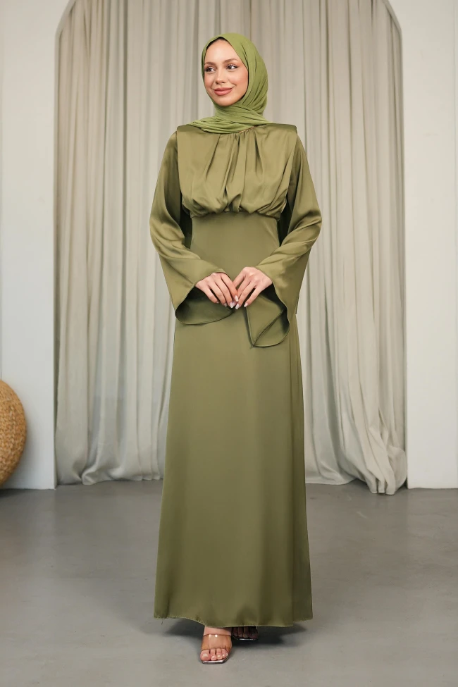 * Ürün Detay :  Abiyemizdeki yakadan başlayan büzgülü yapı, göğüs bölgesinde hacimli ve sofistike bir görünüm oluşturuyor. Abiye modelimizdeki detay, üst bedeni daha formda ve hareketli gösteriyor.Genişleyerek inen kollar, elbiseye hem nostaljik bir hava katıyor hem de modern tesettür giyimde aranan o rahat ve dökümlü şıklığı sağlıyor.Omuzlar vatkalıdır.Sadelikten gelen gücü sevenler için ideal bir tercih.