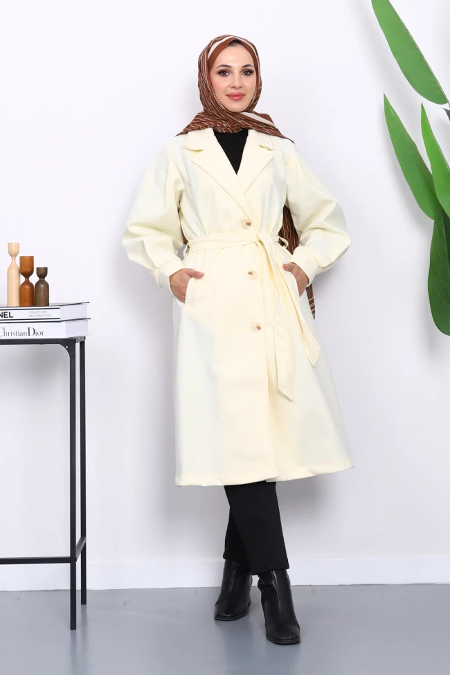 * Ürün Detay : Ürünümüz Kaşe kumaştan üretilmiştir. Ön kısmı düğmeli olup, bel kısmı kuşaklıdır. Yan kısımları ceplidir.