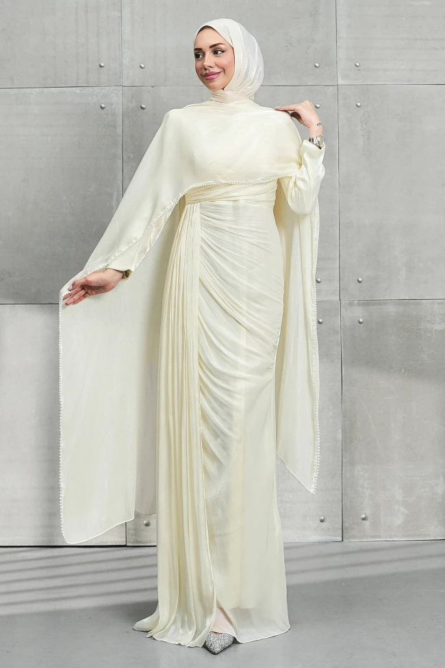* Ürün Detay : Özel günleriniz için kurtarıcı parça! Kendinden pelerinli tasarımı sayesinde aksesuar zahmetine girmeden tam bir şıklık sunan abiyemiz, dikey pileli etek yapısıyla daha uzun ve ince bir görünüm vadediyor.Modern tesettür şıklığını inci zarafetiyle birleştirin.Bel bölgesindeki çapraz drape detayları, karın bölgesini kusursuz bir şekilde kamufle ederken, eteğin dikey pilleleri boyu olduğundan daha uzun gösteriyor.Omuzlardan dökülen tül pelerin, tasarıma dramatik bir hava katarken, kenarlarındaki inci işlemeler yüz hattını aydınlatan zarif bir çerçeve oluşturuyor.