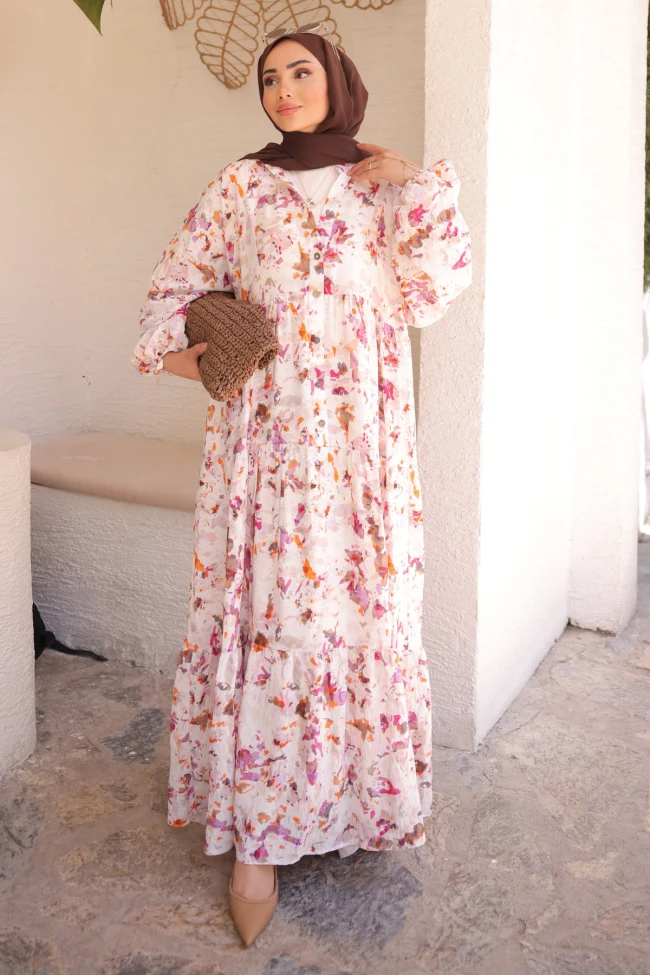 Fuşya Yarım Düğmeli Eteği Katlı Elbise