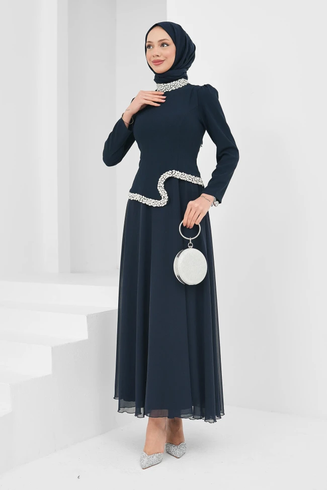 * Ürün Detay : Zamansız şıklık temasını modern taş detaylarıyla birleştiren, oldukça zarif ve rafine bir abiye model ile karşınızdayız.Elbisenin en dikkat çekici özelliği, yaka ve bel hattında kullanılan geniş taş işlemeleri. Yaka kısmındaki taşlar bir kolye etkisi yaratarak yüze ışıltı katarken, beldeki asimetrik kıvrımlı taş hattı silüeti bölerek beli daha ince gösteren bir optik illüzyon yaratıyor.Üst beden daha tok ve formu koruyan bir kumaştan tercih edilmişken, etek kısmında kullanılan hafif şifon doku, elbiseye uçuş uçuş bir hava ve feminen bir hareketlilik kazandırmış.Omuzlardaki hafif büzgüler ve düz kol kesimi, taşların yarattığı ihtişamı dengeleyerek tasarımın asaletini korumasını sağlıyor.özel günlerde "garanti şıklık" arayan, hem klasik hem de modern detayları seven müşteri kitlesi için bu parça ideal bir seçenek olacaktır.