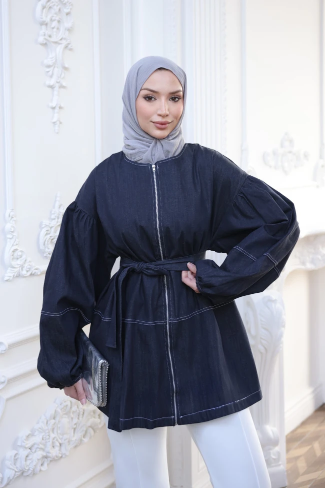 * Ürün Detay : Ceket, denim kumaşın spor havasını sofistike bir terzilikle birleştiren oldukça özgün bir parça.Ceketin en dikkat çekici özelliği, omuzdan başlayan ve bilekte büzülen geniş balon kolları. Bu detay, cekete modern ve avangart bir hava katıyor.Koyu lacivert denim üzerinde kullanılan açık renkli dikişler, parçanın mimari yapısını ve kesim hatlarını vurgulayarak tasarımı daha dinamik hale getiriyor.Önden boydan boya fermuarlı olması kullanım kolaylığı sağlarken, aynı kumaştan yapılan bel kuşağı beli vurgulayarak oversize formu daha kadınsı bir silüete dönüştürüyor.