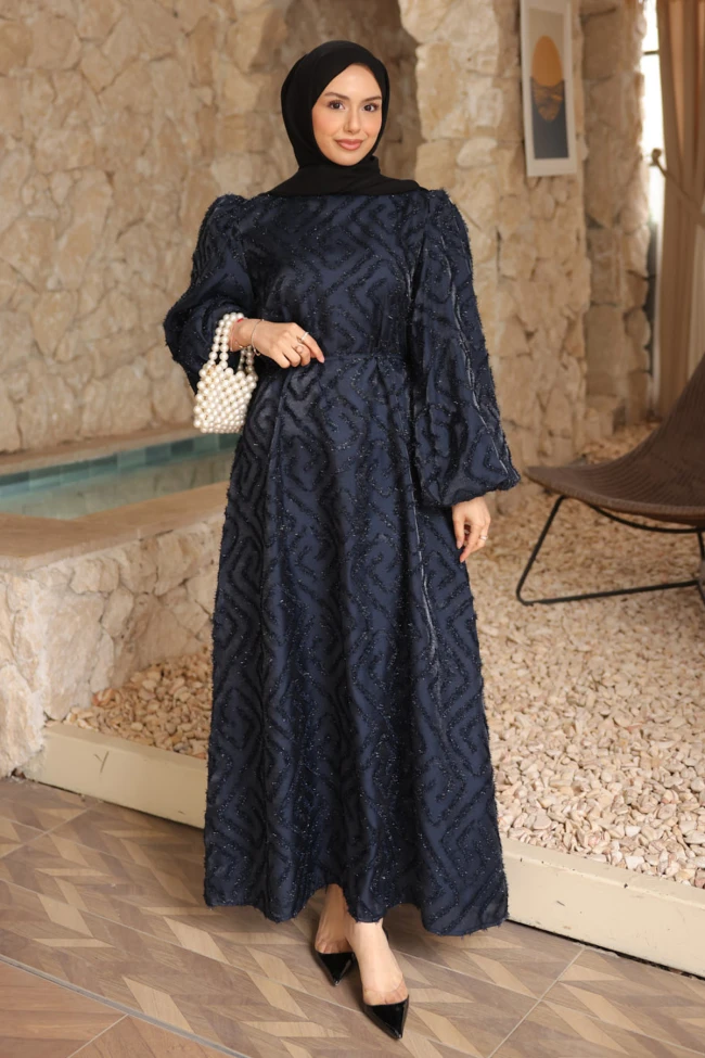 * Ürün Detay : Elbise, hem dokusu hem de kesimiyle oldukça iddialı ve zarif bir parça.Elbisenin en dikkat çekici yanı üzerindeki geometrik labirent desenleri. Kabartmalı ve tüylü dokusu, elbiseye derinlik kazandırarak sıradan bir düz elbiseye göre çok daha lüks ve sofistike bir hava katmış.Balon kol detayı, elbiseye romantik bir hacim katmış. Bilek kısmındaki büzgü, kolların formunu korumasını sağlıyor.Belden oturan ve aşağı doğru hafif genişleyen kesim, vücut hatlarını dengeli bir şekilde kapatırken zarif bir siluet oluşturuyor.