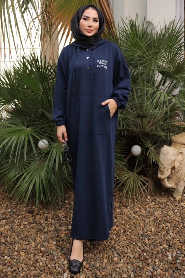 Siyah Baskılı Kapüşonlu İki İplik Elbise Mürdüm Baskılı Kapüşonlu İki İplik Elbise