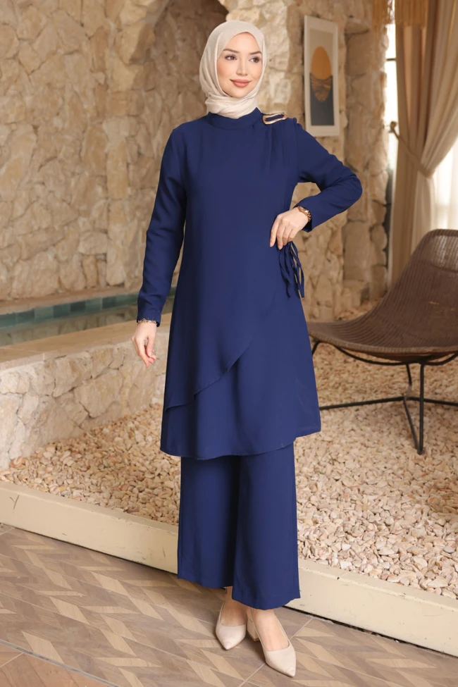* Ürün Detay : Tunik pantolon takımı, modern ve zarif bir stil sunuyor. Hem günlük kullanım hem de özel davetler için uygun olabilecek dengeli bir tasarım.Tunikteki asimetrik ön panel ve yan kısımdaki bağlama detayı, kıyafete hareket katarken aynı zamanda daha ince bir silüet oluşturuyor.Omuzdaki altın rengi metal aksesuar, sade tasarıma lüks bir dokunuş eklemiş. Bu detay, kolye kullanımına gerek bırakmadan yüz bölgesine dikkat çekiyor.Pantolonun hafif geniş kesim olması, konforu artırırken tuniğin asimetrik yapısını dengeliyor.