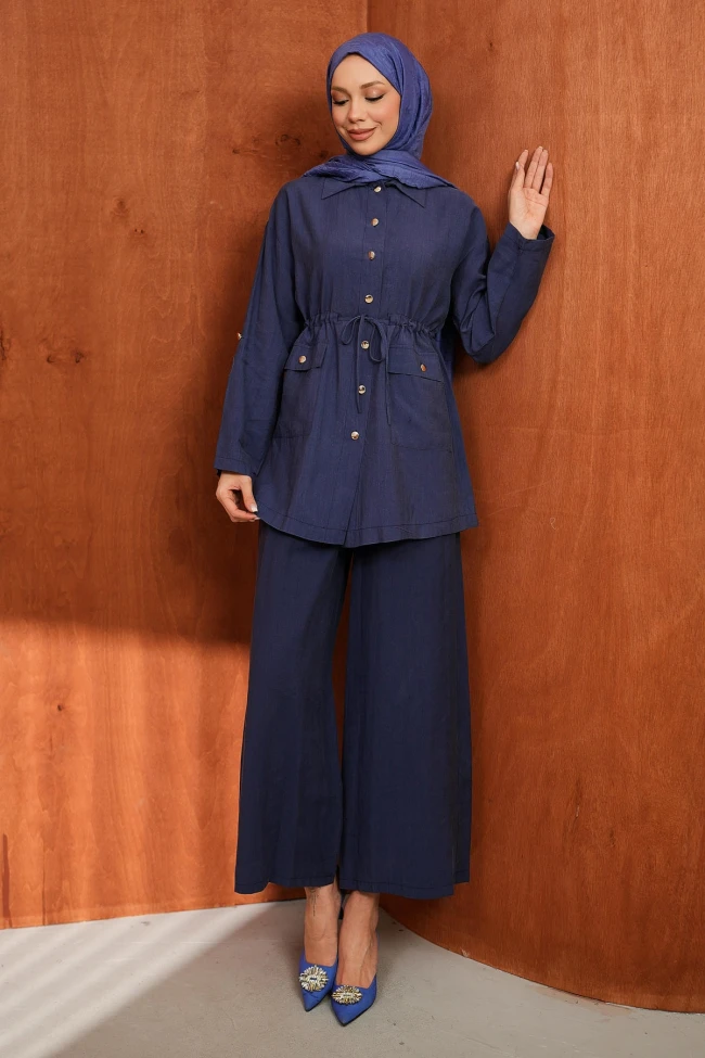 * Ürün Detay : Tunik-pantolon takımı, hem konforu hem de çabasız şıklığı bir araya getiren oldukça dengeli bir parça.Belden büzgülü ipli tasarımı, oversize görünümü kırmadan vücut hatlarını zarifçe belli ediyor. Gömlek yaka ve ön boydan düğme detayı, takıma hem günlük hem de şık bir hava katmış.Geniş paça kesimi, gün boyu hareket özgürlüğü sağlarken aynı zamanda modern bir silüet oluşturuyor.