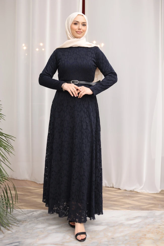 * Ürün Detay : Elbise, hem zarif hem de oldukça asil bir duruşa sahip.Elbisenin tamamının dantel kaplama olması, düz bir kumaşa göre çok daha zengin bir doku oluşturmuş. Dantelin deseni karmaşık ama göz yormuyor, bu da elbiseye romantik bir hava katıyor.Belden aşağıya doğru genişleyen kesim, hem konforlu bir hareket alanı sağlıyor hem de vücut hatlarını zarifçe gizleyerek dengeli bir silüet oluşturuyor.İnce kemer, elbiseyi hareketlendirmiş ve bel hattını belirginleştirerek "kum saati" görünümü yaratmış. Kemerin sadeliği, dantelin hareketliliğini güzelce dengelemiş.
