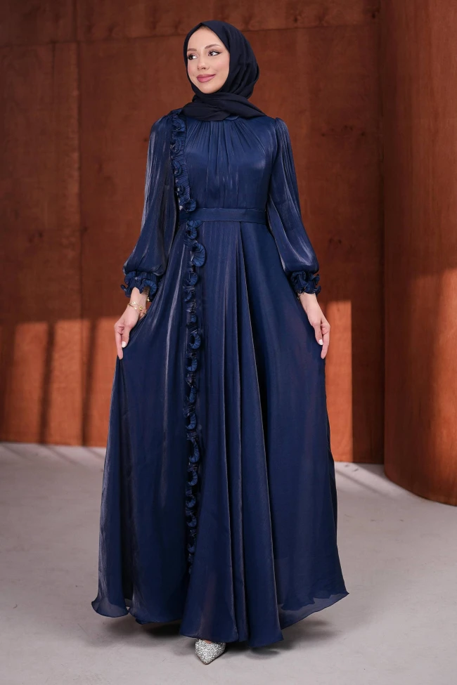 * Ürün Detay : Klasik abiye çizgisinden sıkılanlar için; asimetrik volan detaylarıyla modern zarafeti yeniden tanımlıyoruz.Boyu uzun, beli ince gösteren akıllı tasarımıyla kendinizi bir yıldız gibi hissedeceksiniz.Omuzdan başlayıp boydan boya eteğe kadar uzanan fırfır detayı, elbiseye asimetrik ve modern bir hareket katıyor. Bu dikey hat, silüeti daha uzun ve ince gösteren harika bir tasarım hilesi.Bileklerdeki büzgülü detaylarla birleşen balon kollar, elbiseye romantik ve feminen bir hava katıyor.Kendi kumaşından tasarlanan kuşak detayı, beli nazikçe kavrayarak formun daha düzgün görünmesini sağlıyor."A kesim" formundaki geniş etekler, yürürken adeta akışkan bir su görüntüsü oluşturarak asaletini pekiştiriyor.