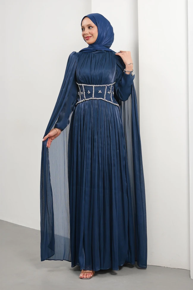 * Ürün Detay :  Abiyemiz, hem ihtişamı hem de geleneksel detayları modern bir formda sunan, oldukça iddialı bir tasarım. Bel bölgesindeki işlemeli ve geniş kemer formu abiyeye şık bir dokunuş sağlıyor. Omuzlardan aşağıya süzülen tül pelerin detayları, elbiseye görkemli bir hava katmış. Bu detay hem kolların formunu zarifçe kapatıyor hem de yürürken masalsı bir akışkanlık sağlıyor.Elbisenin üst bedeni tam otururken, eteğin piliseli ve dökümlü inişi boyu oldukça uzun ve silüeti ince gösteriyor.
