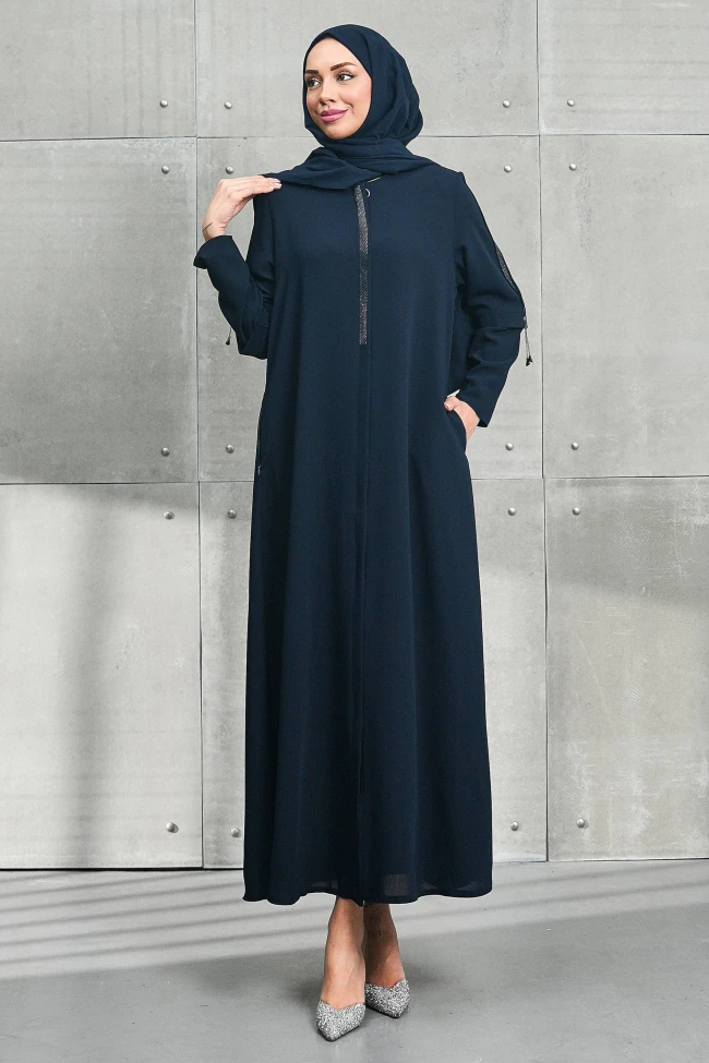 * Ürün Detay : Zarif, göz yormayan ama "buradayım" diyen bir model. Özellikle sadelikten yana olup detaylarda şıklık arayanlar için harika bir tercih.Feracenin aşağı doğru hafifçe genişleyen "A kesim" yapısı, vücut hatlarını belli etmeyen muhafazakar bir duruş sergiliyor. Bu kesim hem konfor sağlar hem de her vücut tipine hitap eder.Ön kısımdaki dikey taş veya payet şeridi, boyu daha uzun ve silüeti daha ince gösterme etkisine sahip.Omuzdan aşağı inen ve manşet kısımlarında küçük sarkıt detaylarıyla tamamlanan şeritler, elbiseye hareket katmış. Klasik ferace çizgisinden çıkıp modern bir hava yakalanmış.
