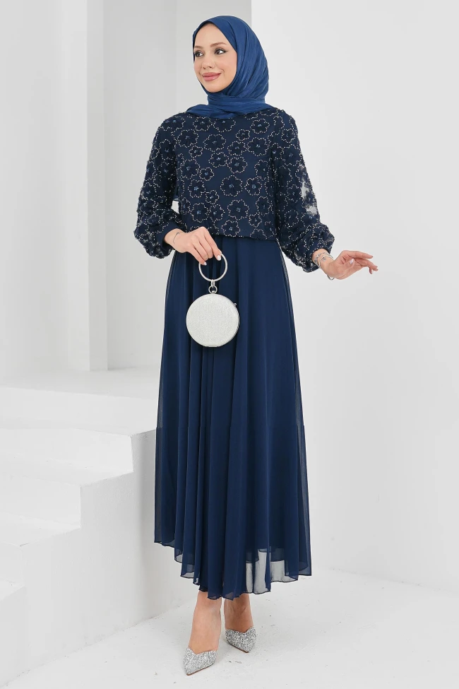 * Ürün Detay : Abiye, hem geleneksel hem de modern detayları bir araya getiren oldukça zarif bir parça.Elbisenin üst kısmındaki işlemeli tül detayı, alt kısımdaki düz şifon etekle güzel bir kontrast oluşturmuş. Üst bedendeki çiçek motifleri ve boncuk işlemeleri elbiseye hareket katarken, eteğin sadeliği bu yoğunluğu dengeliyor.Balon kol tasarımı son dönem tesettür abiye modasında çok popüler. Bilek kısımlarının lastikli veya manşetli olması, kolların formunu korumasını sağlamış.