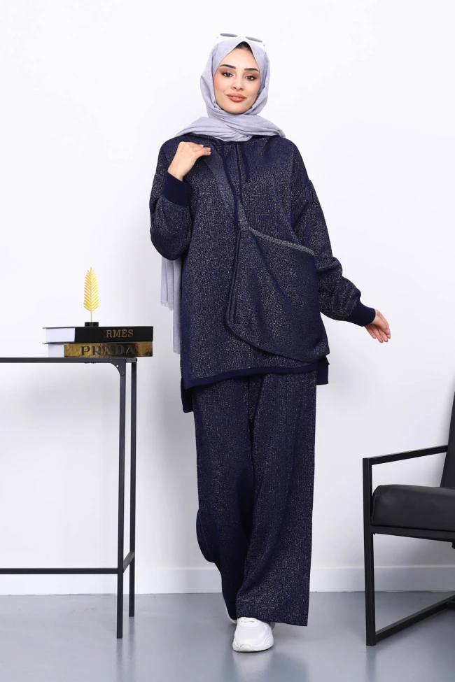 * Ürün Detay : Ürünümüz Simli Triko Kumaştan Üretilmiştir. Hırka ve Pantolon ikili takım şeklindedir. Hırka ön kısmı fermuarlı ve kapüşonlu olarak tasarlanmıştır. Pantolon bel kısmı lastiklidir. Simli dokusu sayesinde özel günlerde dahil rahatlıkla tercih edebilirsiniz. Çantası ürüne aittir.