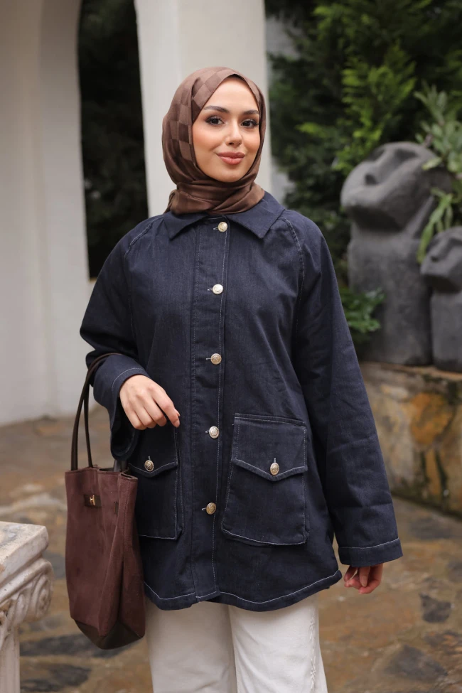* Ürün Detay : Hem spor hem de şık bir tarzı başarıyla birleştiriyor.Ceketin üzerindeki açık renkli belirgin dikişler, lacivert kumaşla harika bir zıtlık oluşturarak parçaya karakteristik bir hava katmış.Klasik bir jean ceketten ziyade, daha premium bir görünüm kazandıran metal düğmeler çok şık bir dokunuş olmuş.Geniş ve kapaklı ön cepler, ceketin modern ve hafif "oversize" havasını destekliyor.Ceketimiz astarlıdır.
